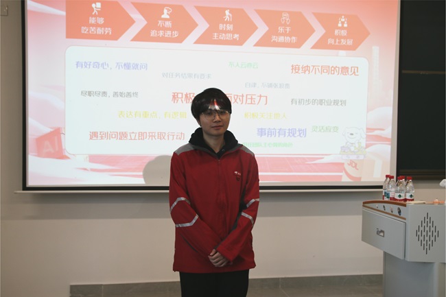 汪新威经理聚焦京东物流发展与招聘核心展开分享。他以京东物流战略布局为引,通过“亚洲一号”智能物流中心实景视频,直观呈现无人仓储、智能分拣等前沿技术应用,让学生深刻感知现代物流的科技属性与行业潜力。针对“新锐之星”项目,他详细介绍了系统化培训、轮岗实践与导师带教的三位一体培养体系,结合“20余名新锐成才率达50%”的案例,展现企业对青年人才的投入力度,并全面解读供应链管理、技术研发等多元职业路径及六险一金、行业竞争力薪资等福利体系,进一步点燃学生求职热情。