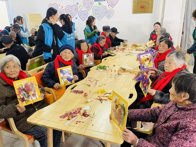 活动最后,志愿者们与老人共同开展干花相册制作活动。志愿者提前准备好各色干花、相册、胶水等材料,耐心指导老人挑选花材、搭配构图,将一朵朵绚丽的干花定格在相册中。老人们兴致勃勃地参与其中,在创作与陪伴中感受动手的乐趣。一朵朵风干的花蕾在指尖重