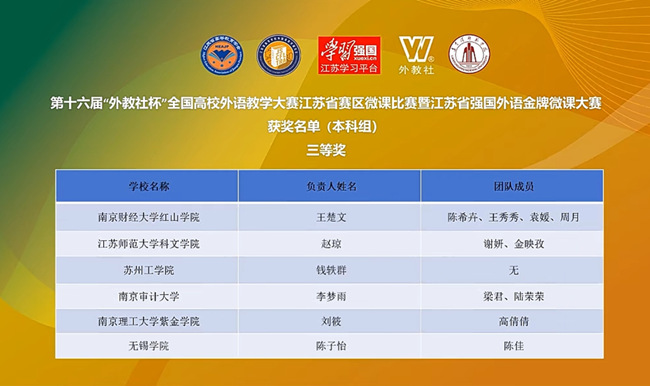 近日,第十六届“外教社杯”全国高校外语教学大赛微课比赛(江苏省赛区)暨江苏省强国外语金牌微课大赛获奖名单揭晓。外国语学院教师团队(负责人:王楚文;成员:陈希卉、王秀秀、袁媛、周月)创作的微课作品《从杜甫到九三阅兵:穿越千年的家国守护》 (英译名:From Du Fu to China’s September 3rd Parade: A National Guardianship Through the Millennium)荣获省级三等奖,展现了学院在外语教学创新与中华文化国际传播方面的积极探索。