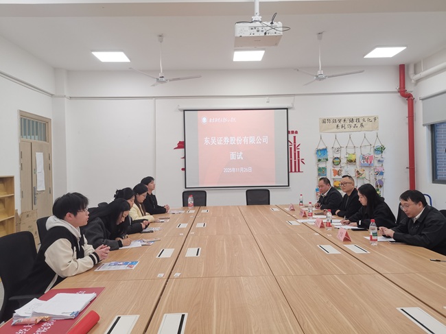 为精准对接企业用人需求,助力2026届毕业生实现高质量就业,11月26日下午,国际经贸学院联合东吴证券股份有限公司举办专场招聘。公司秀财事业部总经理助理、南京分公司副总经理楚殿斌,营业部总经理王鹏,人事经理周知,团队负责人伏鑫受邀在智圆楼开展管培生现场选拔活动。国际经贸学院党总支书记、院长刘志国,党总支副书记陈玉龙到场指导,活动由团总支书记兼学工秘书宋婧牵头组织。本次面试吸引贸易经济、财务管理、金融税收等专业40余名应届毕业生到场参与,现场求职氛围热烈。