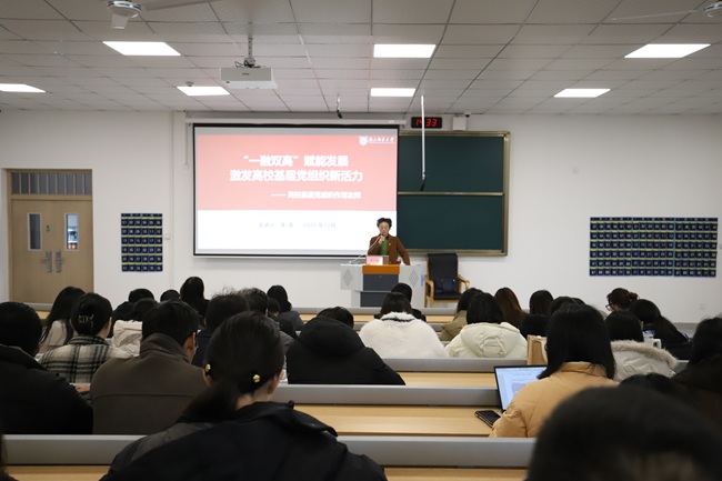 讲座最后,王晨婷副书记作总结讲话。她表示,本次讲座阐释了高校基层党组织作用发挥的关键要点,既有高屋建瓴的理论指引,又有接地气的实践案例,更有可复制、可推广的工作方法,为学院进一步加强基层党组织建设,推动基层党组织作用发挥提质增效起到了很好的指导作用。她要求,各基层党组织要结合自身工作实际探索党建“一融双高”新思路新举措;要坚持问题导向,补齐工作短板,不断推动基层党建工作提质增效;要充分发挥基层党组织的战斗堡垒作用和党员的先锋模范作用,把党建优势转化为学院发展优势,为推动学校高质量发展、培养德智体美劳全面发展的社会主义建设者和接班人提供坚强的组织保障。