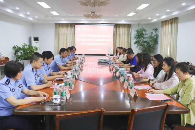 双方在桥头校区311会议室开展党建共建座谈会暨签约仪式。江苏省句容监狱机关第四党支部书记曹弼与文法系党总支副书记陈萱代表双方签订党建共建协议,双方分别就各自党组织基本情况和党建工作亮点展开介绍。