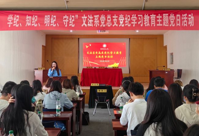 为深入学习贯彻习近平新时代中国特色社会主义思想和党的二十大精神,深入推进党纪学习教育走深走实,引导广大师生党员认真学习贯彻《中国共产党纪律处分条例》,5月22日下午,文法系党总支在桥头校区沐德苑报告厅举办了“学纪、知纪、明纪、守纪”党纪学习教育主题党日活动。文法系全体党员和党的发展对象、入党积极分子代表参加活动。