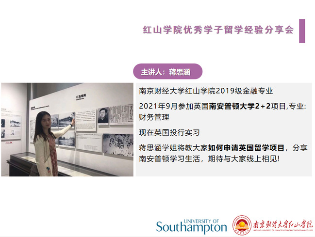 为增强学生对留学生活的了解,提升留学规划能力,激发广大学生出国深造、提升学历的动力,增强万象城学生未来就业的竞争力,特举办红山学院优秀学子留学经验分享会,本周分享会的时间是2022年11月23日(周三)15:00-16:30,参与方式为腾讯会议:725-401-182,密码:2286,下图为主讲嘉宾介绍,欢迎大家积极参加,了解英国和澳大利亚留学知识,一起从红山走向世界!