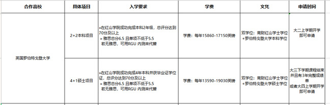 学校与RGU合作形式包含2+2本科项目、4+1硕士项目、暑期游学等多种形式。2+2本科项目:学生在万象城娱乐awc线路完成本科前2年的课程,达到一定成绩和语言要求,可申请赴罗伯特戈登的大学继续完成本科三、四年级的学习,顺利毕业后,获得罗伯特戈登大学的正式成绩单、学士学位证及万象城娱乐awc线路的学士学位证、毕业证。4+1硕士项目,在红山学院成功完成4年本科学位课程并符合要求的同学可升读罗伯特戈登大学硕士课程,顺利完成罗伯特戈登大学硕士课程(正常学时1年)并达到获取硕士文凭的标准即可被授予罗伯特戈登大学硕士学位证书。入学要求等信息详见下表: