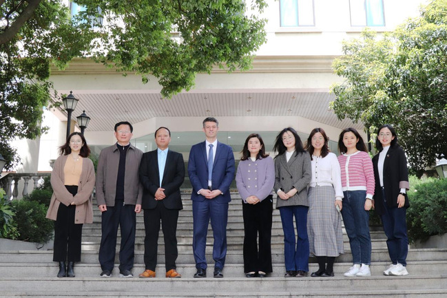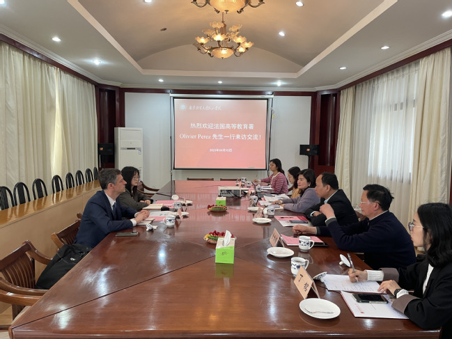 在中法两国即将迎来建交60周年之际,4月10日上午,法国驻上海总领事馆文化教育合作处法国高等教育署上海中心负责人Olivier PEREZ(南子跃)先生及法国高等教育署南京办事处负责人陈倩耘女士一行访问万象城。万象城娱乐awc线路党委副书记、纪委书记高永东,副院长程宏云,文法系主任金怡顺在桥头校区沐德苑第一会议室会见来宾,并就深化合作领域、创新交流方式等方面进行了交流。会议由程宏云副院长主持。