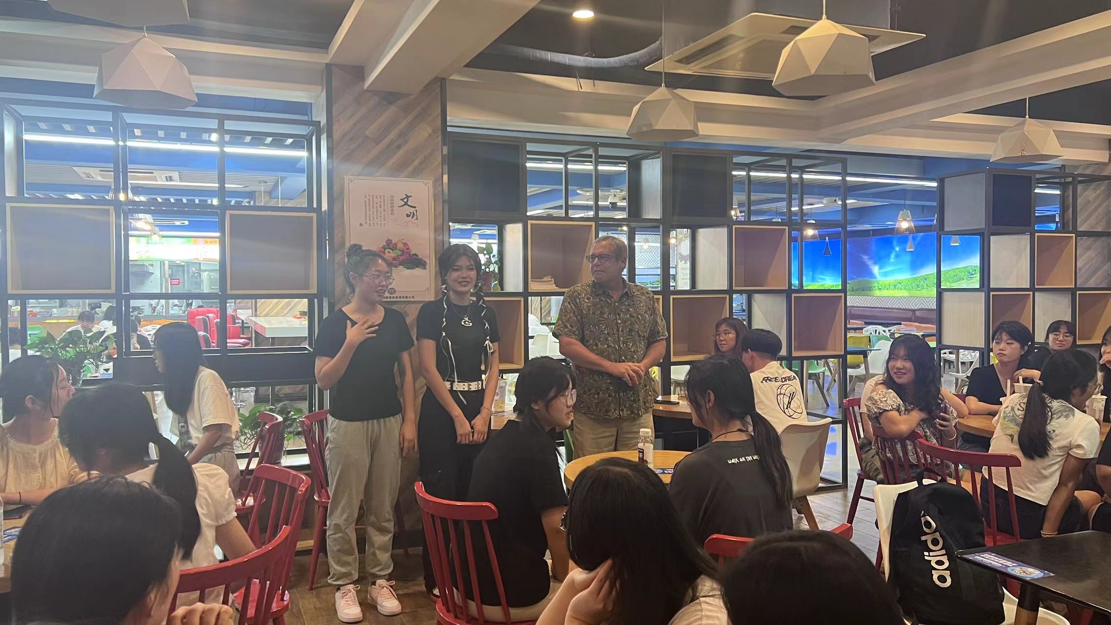 为提升学生英语口语水平,营造学院国际化氛围,2023年9月17日晚18:30-20:00学院于南山风情地下一层开展了首期英语角活动。文法系外籍教师Thomas、国际处职员石雪、赵琪与四十余名学生共同就暑期生活、最喜爱的演员等话题展开口语对话。外教Thomas鼓励学生克服羞怯心理,勇敢表达自己观点。活动现场氛围热烈,师生相约每周日不见不散。