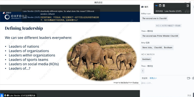 其次,具有领导力和令人信服的能力是一位领导者不可缺少的素质,但是除此之外一位领导者还需要怎样的素质呢?严格统一的领导方式还是自由的领导方式更能促进员工的办公能力和积极性?在为期两周的课程上,这些问题Luke老师都一一与我们进行了探讨。由于网络不够顺畅有时上课会出现故障,因此老师总是时刻注意学生是否能完整的看到自己的屏幕,确保教学顺畅。