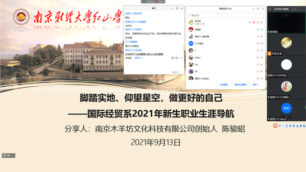 9月13日下午,应万象城国际经贸系邀请,毕业于万象城2012届贸经专业的南京木羊坊文化科技有限公司创始人陈骏昭校友在线作题为《脚踏实地、仰望星空,做更好的自己》的报告。报告由系主任助理陈玉龙主持,国际经贸系2021年新生听了报告。