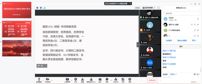 9月14日上午,红山学院国际经贸系通过“腾讯会议”在线召开了国际经贸系2021级新生朋辈分享会,本系2018、2019级的4位学生代表受邀做了分享,国际经贸系2021级新生参加,会议由系团总支书记兼学工秘书宋婧主持。