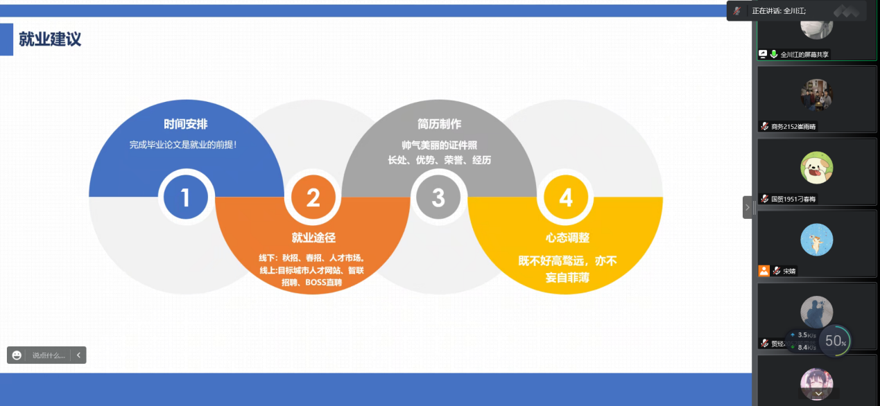 11月20日上午,应国际经贸系邀请,3名2022届优秀校友代表做客第一场“就业指导月”活动——朋辈就业经验分享会。此次活动由系学工秘书宋婧老师牵头组织并主持,我系各年级部分学生通过线上腾讯会议参会。