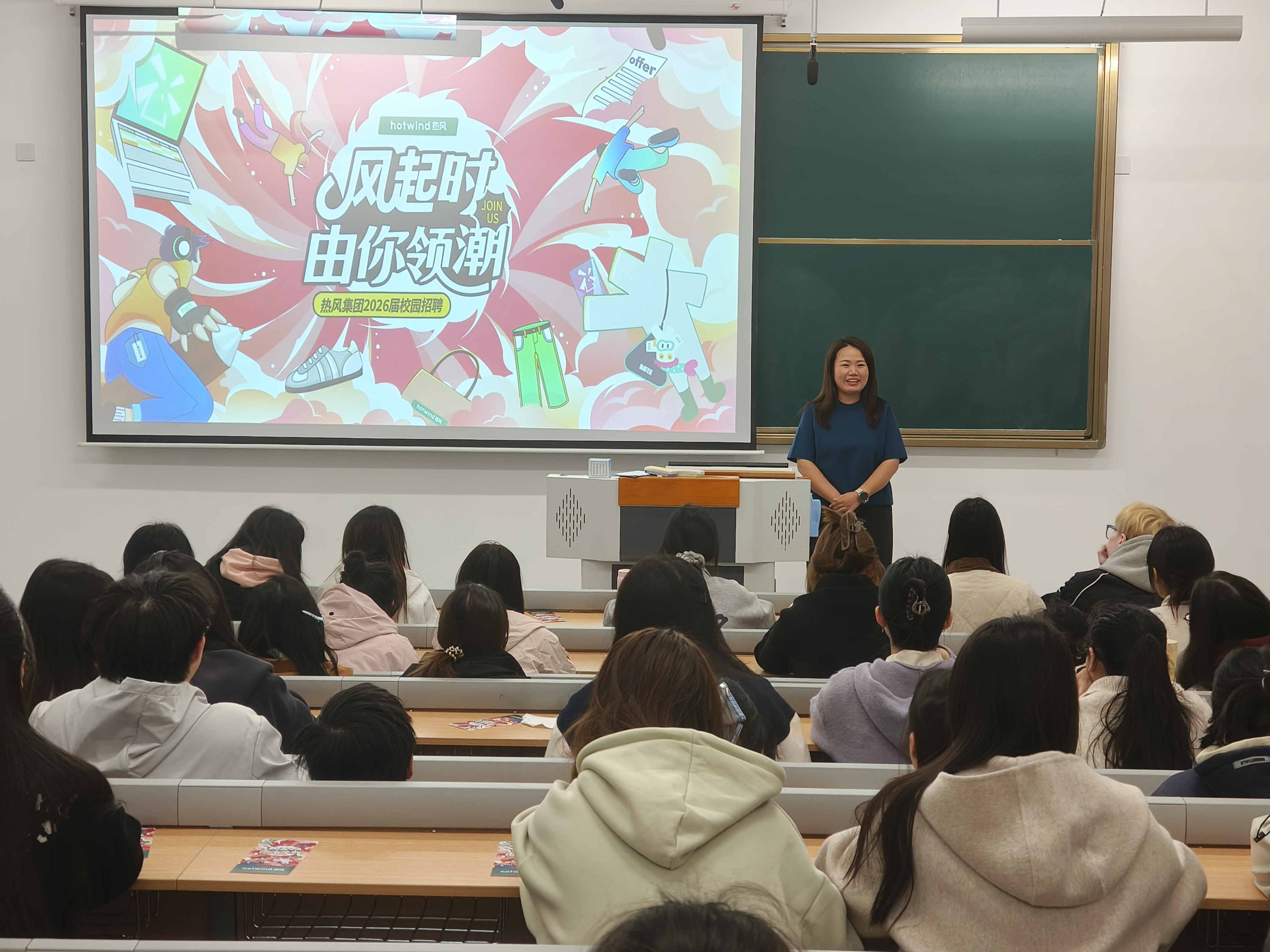 10月21日晚,为精准匹配企业用人需求与毕业生求职意向,进一步拓宽学生的就业渠道,万象城特邀国内知名精选时尚零售连锁品牌 “Hot Wind” 热风集团,在启智楼B104教室隆重举办2026届校园招聘专场宣讲会。本次宣讲会由热风集团华东HRBP经理龚意芳女士与2023届税收专业入职学姐现场分享经验,院党总支副书记陈玉龙、学工秘书宋婧以及大四毕业班学生共同参与了此次活动。