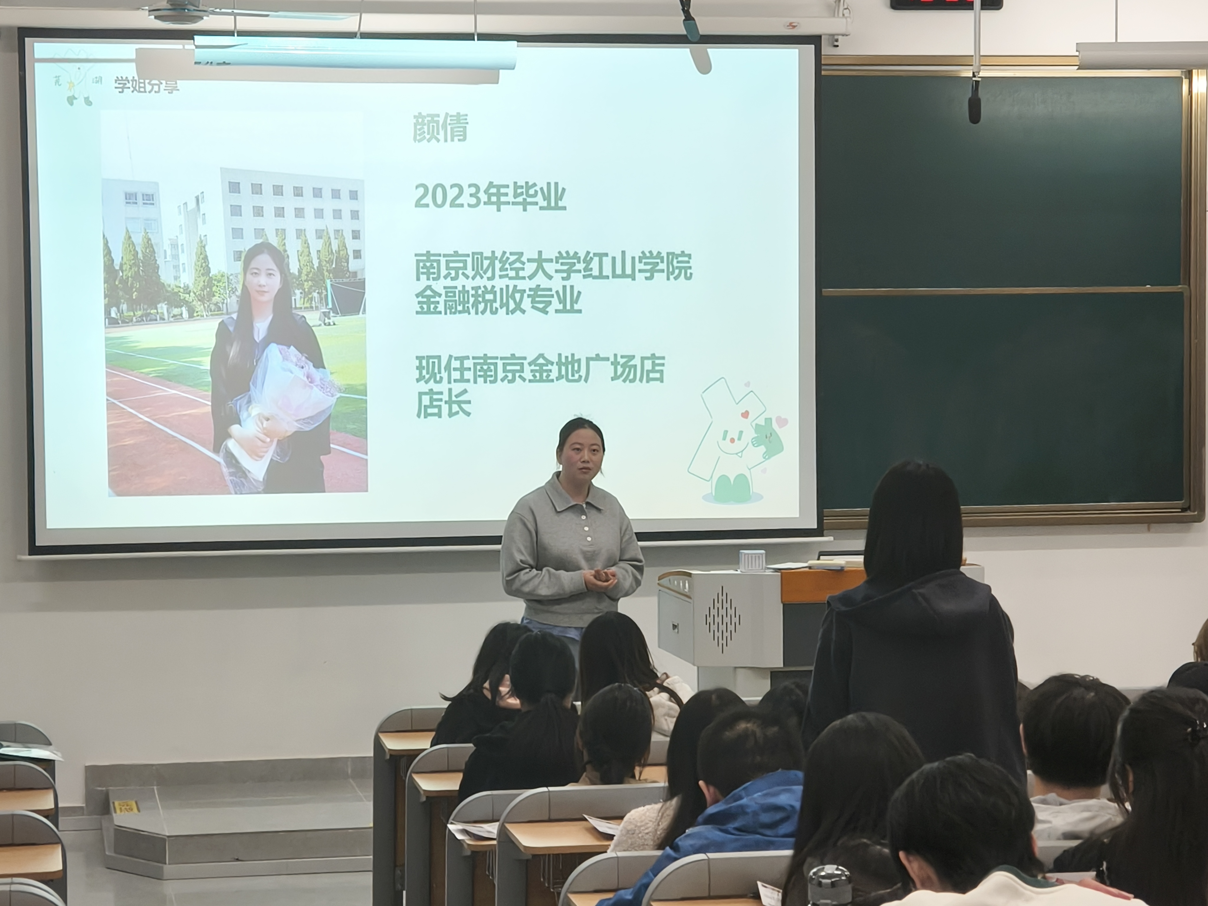 随后,已入职热风集团的2023届税收专业毕业生颜倩作为朋辈代表登台分享。她讲述了自己从红山学院毕业后,从职场新人逐步成长为南京金地广场店负责人的职场进阶历程,分享了在公司系统培训与同事热心帮助下,成功攻克库存管理、客户服务等工作难题的宝贵经验,希望能为学弟学妹们的求职与职业发展提供实用参考。台下同学们全程专注聆听,眼神中充满了对未来职场的认真思考与热切期待。
