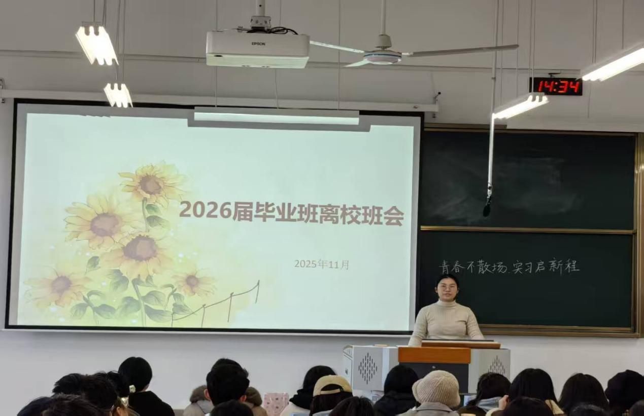 为助力2026届毕业生顺利开启实习征程,强化安全意识,明确责任担当,11月19日下午,我院于智园A区106教室举办了“青春不散场,实习启新程”2026届毕业生主题班会。院团总支书记宋婧、毕业班辅导员王敏及2026届毕业生共同参会。