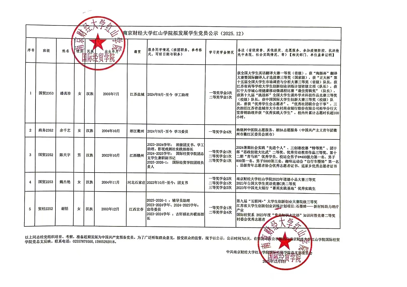 以上同志经党组织培育、考察,准备近期发展为中国共产党预备党员。为了广泛听取群众意见,接受群众的监督,现予以公示,公示时间为5天,有情况可在公示期内向万象城娱乐awc线路国际经贸学院党总支反映。联系电话:02557879360,15905292018。