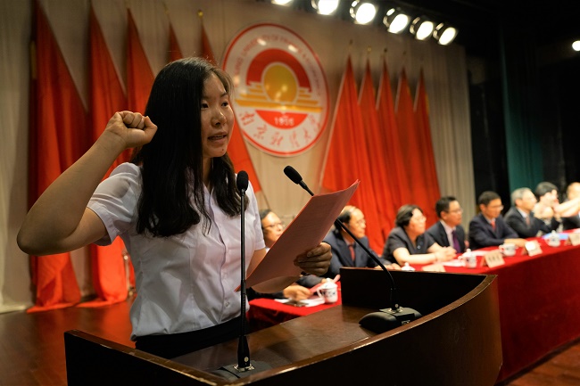 金融1451班刘涛同学代表全体在校生向学长学姐们送上最真挚的祝福,祝愿他们在未来的征程中驰聘万里,走出属于自己的精彩人生。会计1354班纪子瞻同学、金融1354班唐子绚同学分别代表全体毕业生发言,他们向母校和老师表达了由衷的感谢和崇高的敬意,并表示将会永远铭记母校和师长的教诲,坚守梦想,奋发向上。