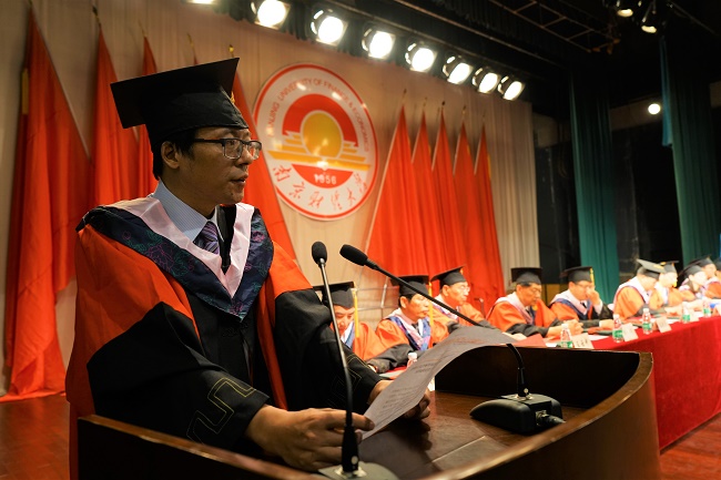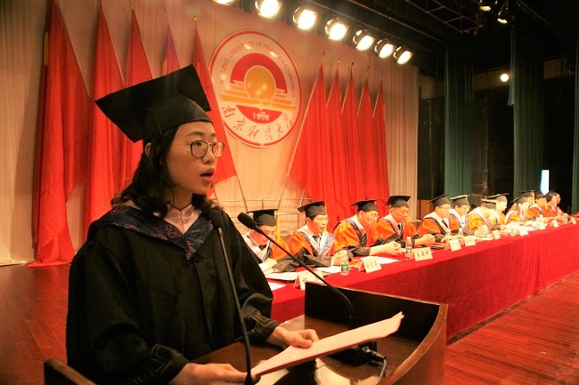 金融1357班葛文康同学和会计1351班王天颖同学作为学士学位获得者代表分别发言。葛文康同学感谢母校塑造了他勤奋朴实的品质,培育了他积极向上的人生观,他表示无论何时都不会辜负母校的希望,锐意进取,也希望母校的明天更加灿烂辉煌。王天颖同学回忆了在红山学院学习、生活的点滴,表达了依依不舍的离别之情,同时她表示对未来有着坚定的信心,勾勒了对未来的美好蓝图。