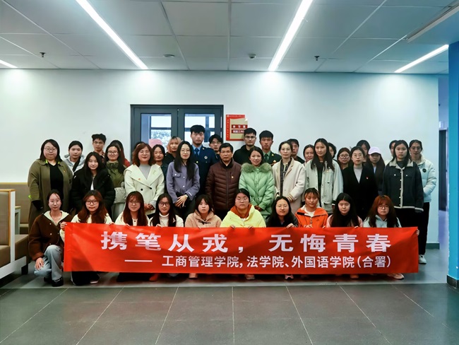 为积极响应国家号召,激励更多优秀大学生踊跃参军入伍、献身国防事业,3月12日下午,工商管理学院和法学院、外国语学院(合署)在1号站党团活动室联合开展“携笔从戎 无悔青春”征兵宣讲活动。工商管理学院党总支书记、院长张太海,工商管理学院党总支副书记王海萍,法学院、外国语学院(合署)党总支副书记陈萱,学生处资助中心主管、征兵工作负责人刘馈馈,法学院、外国语学院(合署)团总支书记赵悌芳,工商管理学院团总支书记何玉凤,工商管理学院“一职为你”就业教育工作室指导老师方硯琳及三位优秀学生代表等参加活动。