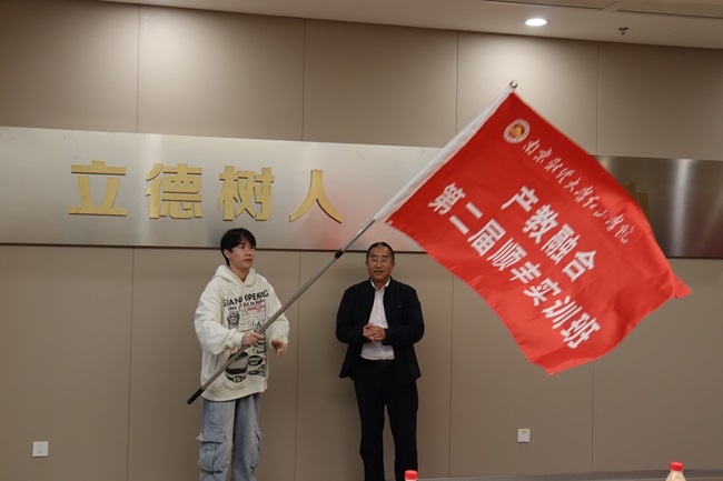 学院党政办主任、党群工作部部长曹进为实训班授旗,标志着新一期校企协同育人实践正式启航。