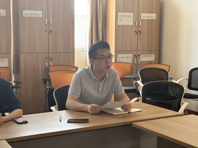 数学课程组负责人朱明海发言,他就数学课程各教学环节提出统一要求,包括平时成绩、日常备课、课堂纪律、阅卷登分、师德师风等。他强调,教学质量是学校发展的核心,希望全体数学任课教师从我做起,认真对待每一堂课,营造良好的教风。