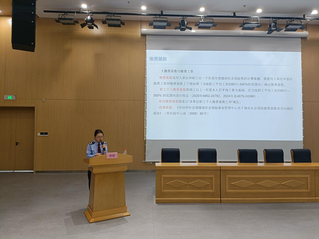 讲座聚焦“社保费缴纳常见问题”和“企业经营中的涉税风险与个人所得税实务”两大主题。在社保费板块,徐颖同志通过缴费基数说明图,详细讲解了参停保登记、缴费基数核定、申报方式与期限等关键内容,同时结合新参保、跨年补报等实际案例,深入阐述了常见操作流程,并着重强调了用人单位按月申报、代扣代缴的法律责任及滞纳金相关规定,为学生厘清了社保费缴纳的法律义务与操作要点。