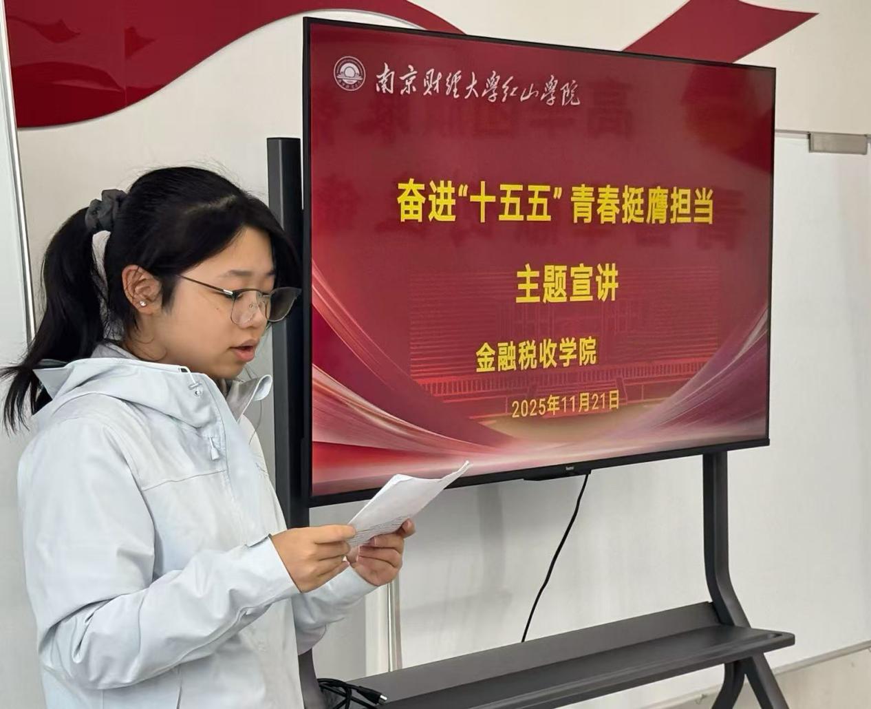 学院团总支部门负责人、2024级税收学专业李雨轩同学以“洞察‘十五五’新蓝图,谱写金融税收新篇章”为题作主题发言。她结合专业学习,从高质量发展、科技金融、绿色转型、共同富裕等维度,解读了“十五五”规划对金融与税收领域提出的新要求和带来的新机遇,鼓励同学们将个人成长融入国家发展大局。