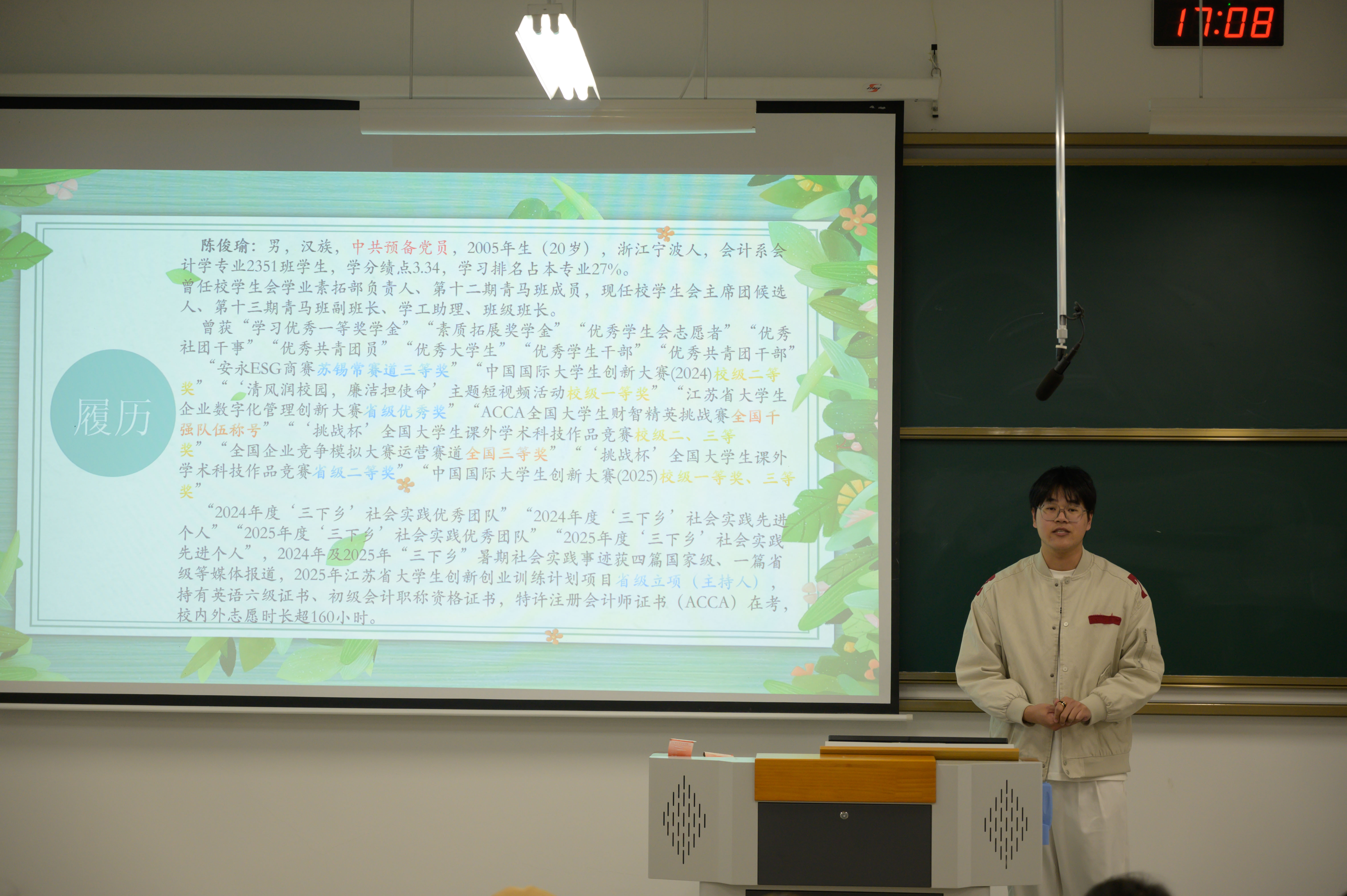 为强化学风建设,搭建优质学习交流平台,11月12日晚,会计学院学生会于智圆楼A-103教室举办优秀学子学习经验分享会,特邀23级优秀学生代表陈俊瑜、杨鑫雨现场分享学习心得,畅谈个人成长感悟。活动由学生会学业素拓部徐学研主持。