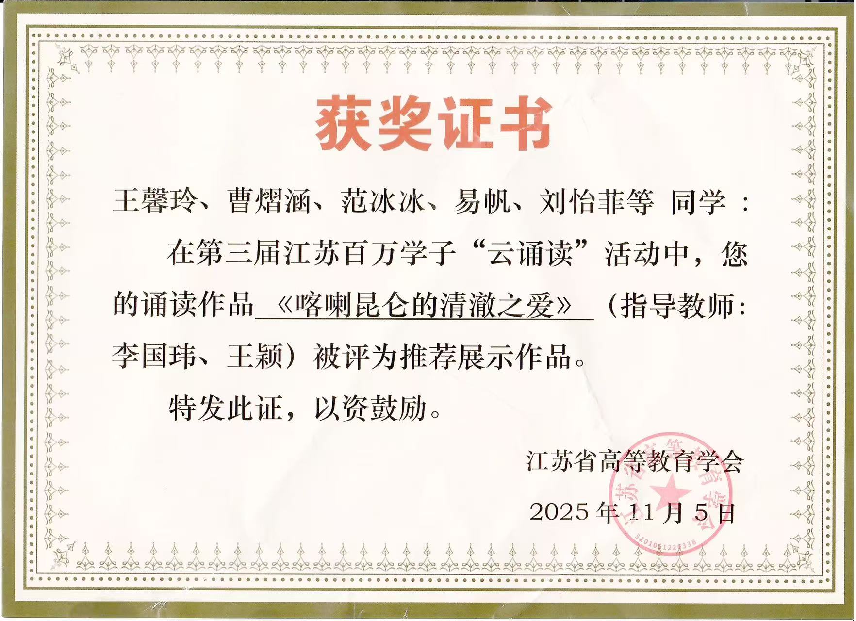近日,由江苏省教育厅举办的第三届江苏大学生读书文化节落下帷幕。我院学子在“云诵读”大赛中表现亮眼,审计2254班王馨玲同学的团队作品《喀拉昆仑的清澈之爱》获评“推荐展示作品”。