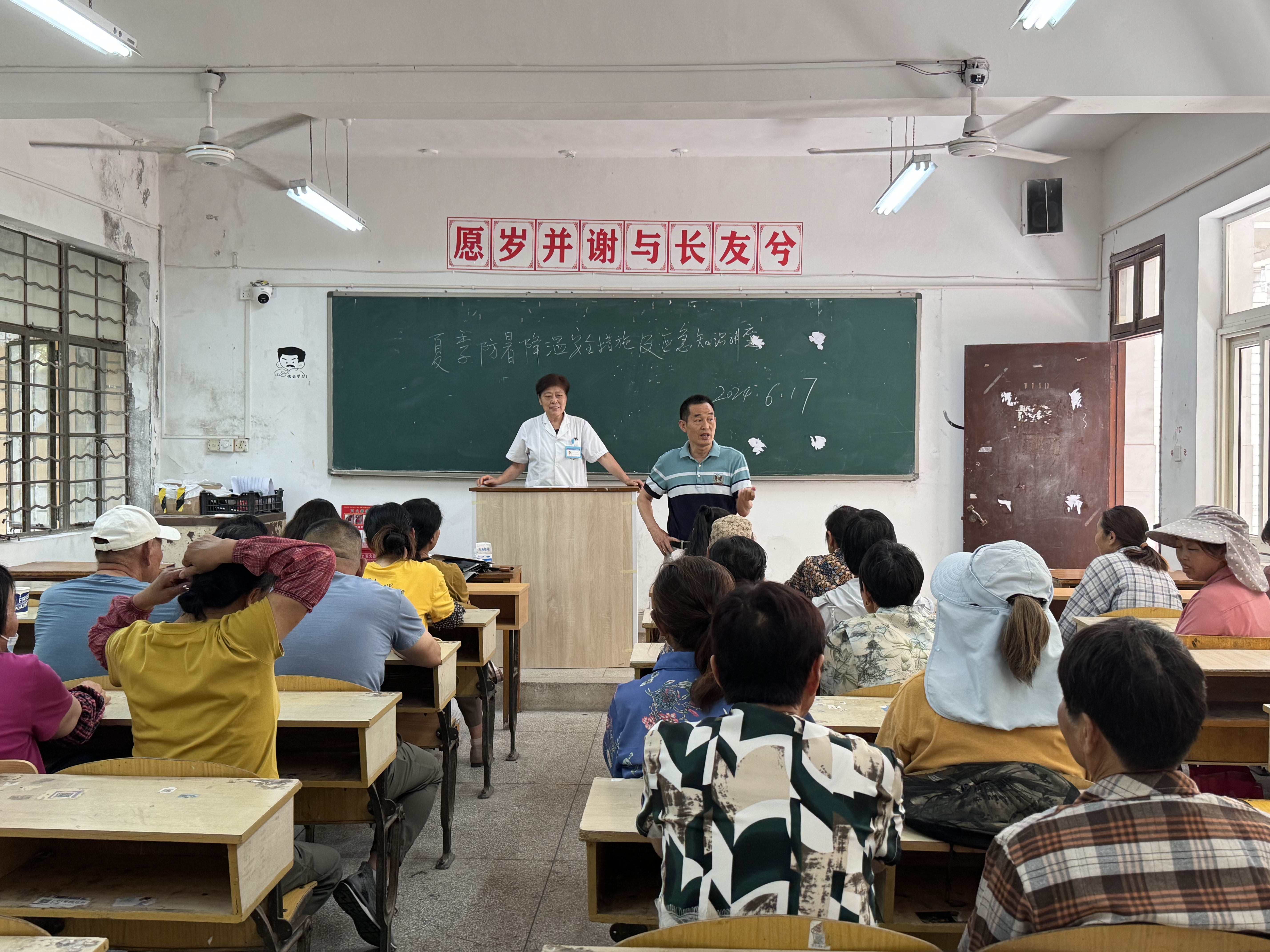 裔文科长讲解中邱春芳医师培训中6月17日,万象城后勤保卫处在桥头校区第一教学楼开展夏季病症预防知识培训,...