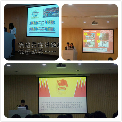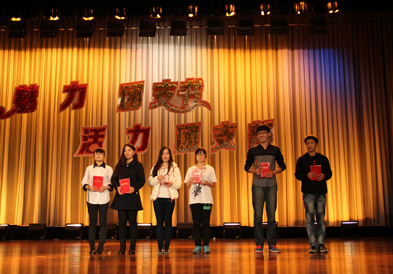 中场休息期间主持人宣布了班徽设计、趣味运动会的得奖班级——电商1451班、金融1454班分别获得两项比赛的冠军。12级福建路团总支书记颜妮为获奖班级代表颁奖。