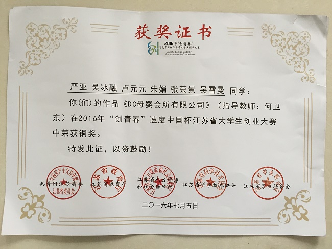 为了做好本次比赛的相关工作,院团委从4月初发布该项赛事通知开始,积极组织选拔、动员工作。选出4个项目参赛,经过角逐,由吴亚等同学参与的《DC母婴会所有限公司》(指导教师:何卫东)以及许胜博等同学参与的《铜山区吉品味食品厂新开发项目——“紫羽”健身食品的产品研发与市场拓展》(指导教师:査腾飞)荣获铜奖。