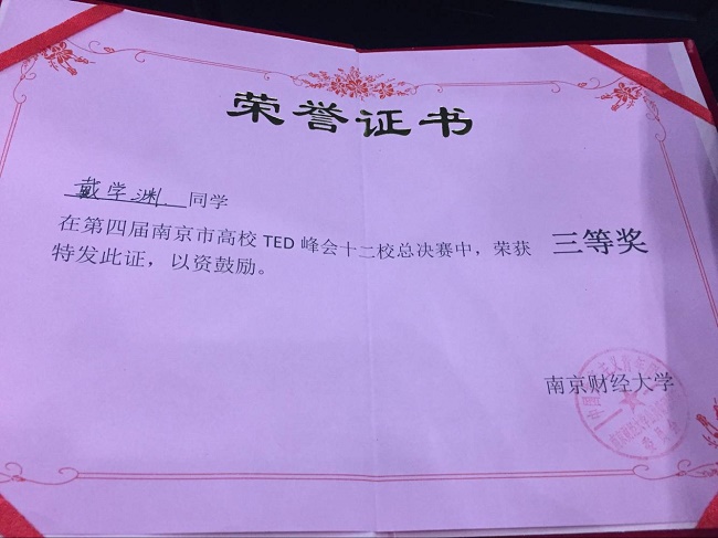 本次峰会共分为主题演讲、即兴演讲两轮。在主题演讲中,戴学渊同学抽中“为什么我还是只单身狗”的命题。他以幽默风趣的谈吐、落落大方的仪态赢得了评委老师的青睐,顺利通过第一轮的比拼。在第二轮中,戴学渊即兴演讲“他人的眼光”,用词简练得当,慷慨激昂,赢得阵阵掌声。最后,经评委老师点评打分,戴学渊同学荣获三等奖以及优秀风度奖。