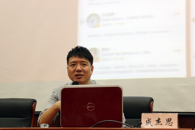 讲座初始,成老师介绍了自己主持的节目、工作室以及近几年来创办的活动,多方位发展,完善自身定位。近年创作了歌曲《盐城真漂亮》、《大学南京》,美食武侠小说《饕餮英雄》和电影《大学南京》和《单身狗》等多部影视作品,反响强烈,特别是大学生认可度极高。