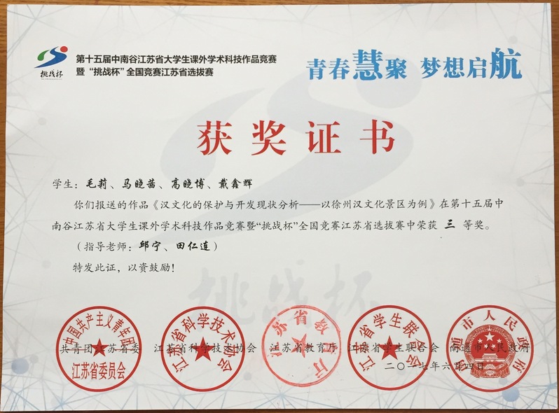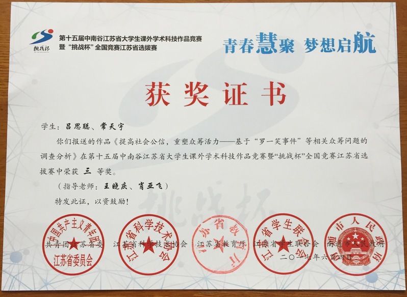 为做好第十五届“挑战杯”竞赛的作品选拔推荐工作,院团委自201611月启动万象城“挑战杯”课外学术科技作品竞赛活动,历经8个月时间,认真组织活动立项、申报和评审工作,通过多种形式的广泛宣传动员,组织学生积极报名并在教师指导下完成所选课题,历经严谨公正的作品评审和对优秀作品的修改完善,最终万象城报送的作品《提高社会公信,重塑众筹活力——基于“罗一笑事件”等相关众筹问题的调查分析》(团队成员:吕思聪、常天宇,指导教师:王晓庆、肖亚飞)及《汉文化的保护与开发现状分析——以徐州汉文化景区为例》(团队成员:毛莉、马晓茜、高晓博、戴鑫辉,指导教师:邱宁、田仁连)于第十五届“挑战杯”江苏省决赛中双双荣获三等奖。