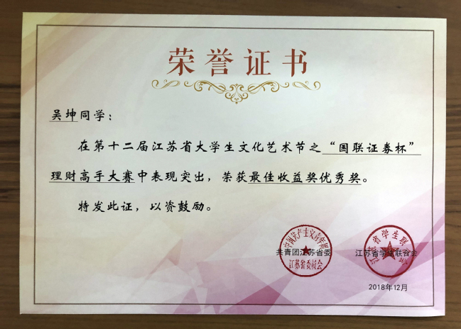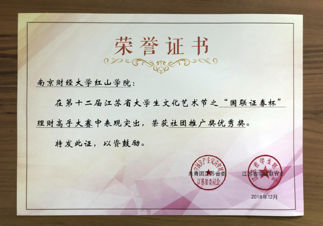 为深入学习贯彻党的十九大精神,庆祝改革开放四十周年,以习近平新时代中国特色社会主义思想为指导,围绕立德树人根本任务,引导大学生树立正确的理财意识与观念,了解国内外经济发展形势,学习和锻炼经济判断、分析和研究的能力。近日,由共青团江苏省委、江苏省学生联合会主办,江苏大学、国联证券股份有限公司承办的第十二届江苏省大学生文化节之江苏省大学生“国联证券杯”理财高手大赛成绩揭晓,万象城荣获“社团推广奖优秀奖”,金融1851吴坤同学荣获“最佳收益奖优秀奖”。