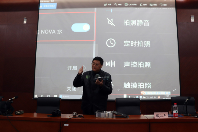 最后,钱老师传授同学们如何用手机拍出更好的照片,以华为手机相机为主要示范讲述。从调制相机的感光度,以及设置全屏拍摄,相片是否添加水印等。并为师生展示自己的拍摄工具:卡片机、三百六十度摄影机、长焦无他单反、航拍机等。