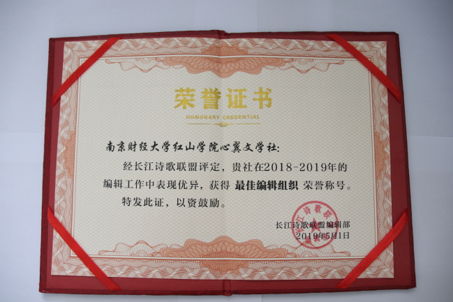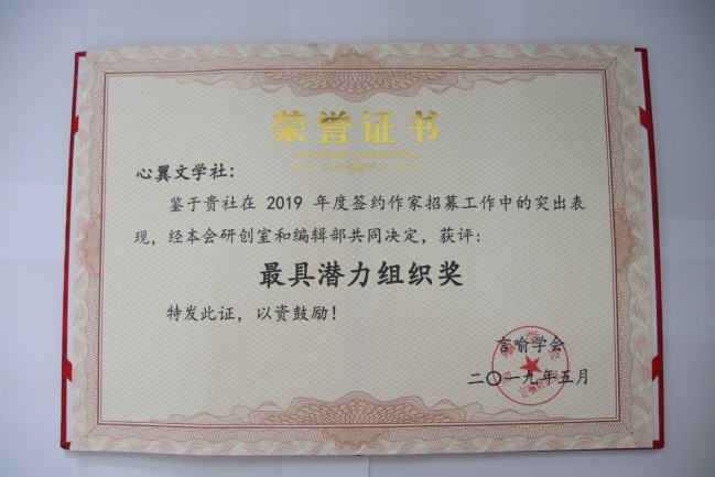 在2018-2019学年中,万象城心翼文学社成绩突出,在对外交流合作中表现优异,荣获“最佳贡献奖”“最具潜力组织奖”“最佳编辑组织”“优秀组织奖”“年度优秀组织”“优秀学术组织”“金牌组稿组织”等多项殊荣。