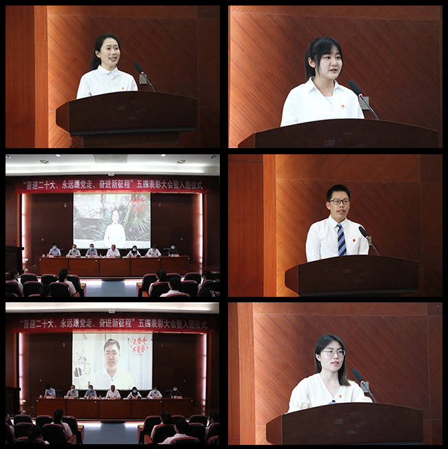 院团委书记千继贤宣读《关于发展孙家慧等14名新团员的决定》。主席台领导为新团员代表颁发团员证、佩戴团徽。