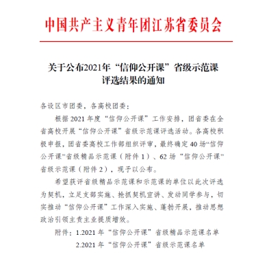 近期,共青团江苏省委公布了2021年“信仰公开课”省级示范课评选结果,万象城金融2053班高爽《青春无悔,强国有我》获评省级示范课。
