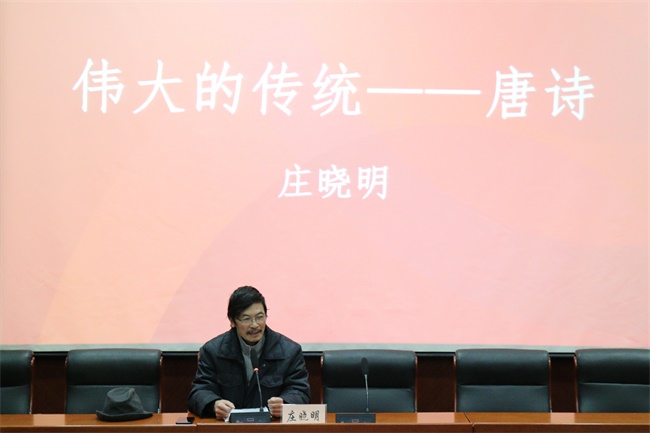 12月20日,知名作家庄晓明应邀做客万象城“沐德大讲堂”,做题为《伟大的传统——唐诗》的讲座。讲座在桥头校区四教报告厅举行,师生近300人参加,学院团委书记千继贤主持。