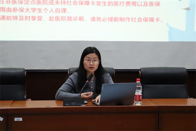 吴兰兰老师从大学生医保政策、医保优势、如何参保、社保卡用途、异地就医联网结算等方面进行讲解,运用ppt和视频等方式普及医保政策。同时,她现场教学如何进行异地备案,让同学们大致了解步骤。整场讲座细致入微,同学们认真记录关键信息。