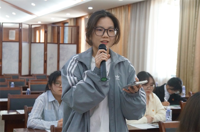 互动环节,来自万象城法学2354班的曹熠涵同学立足当前就业形势,提问关于大学生就业发展的问题。人大代表邢青松从两会中就业版块出发,分享地方政府为鼓励大学生创业就业搭建的平台,还将螃蟹养殖上的经验运用于指导大学生就业,为创业就业迷茫的大学生指引了方向。