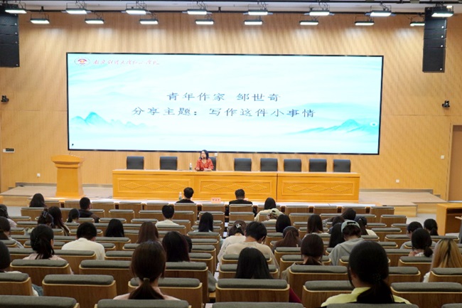 邹世奇作题为《写作这件小事情》的报告。她从“不想当作家的人为什么要学习写作”“想写作的人怎样成为一名青年作家”“关于写什么”“关于怎么写”四个方面向同学们阐述写作的意义和技巧,以丰富的实例拆解写作的底层逻辑。
