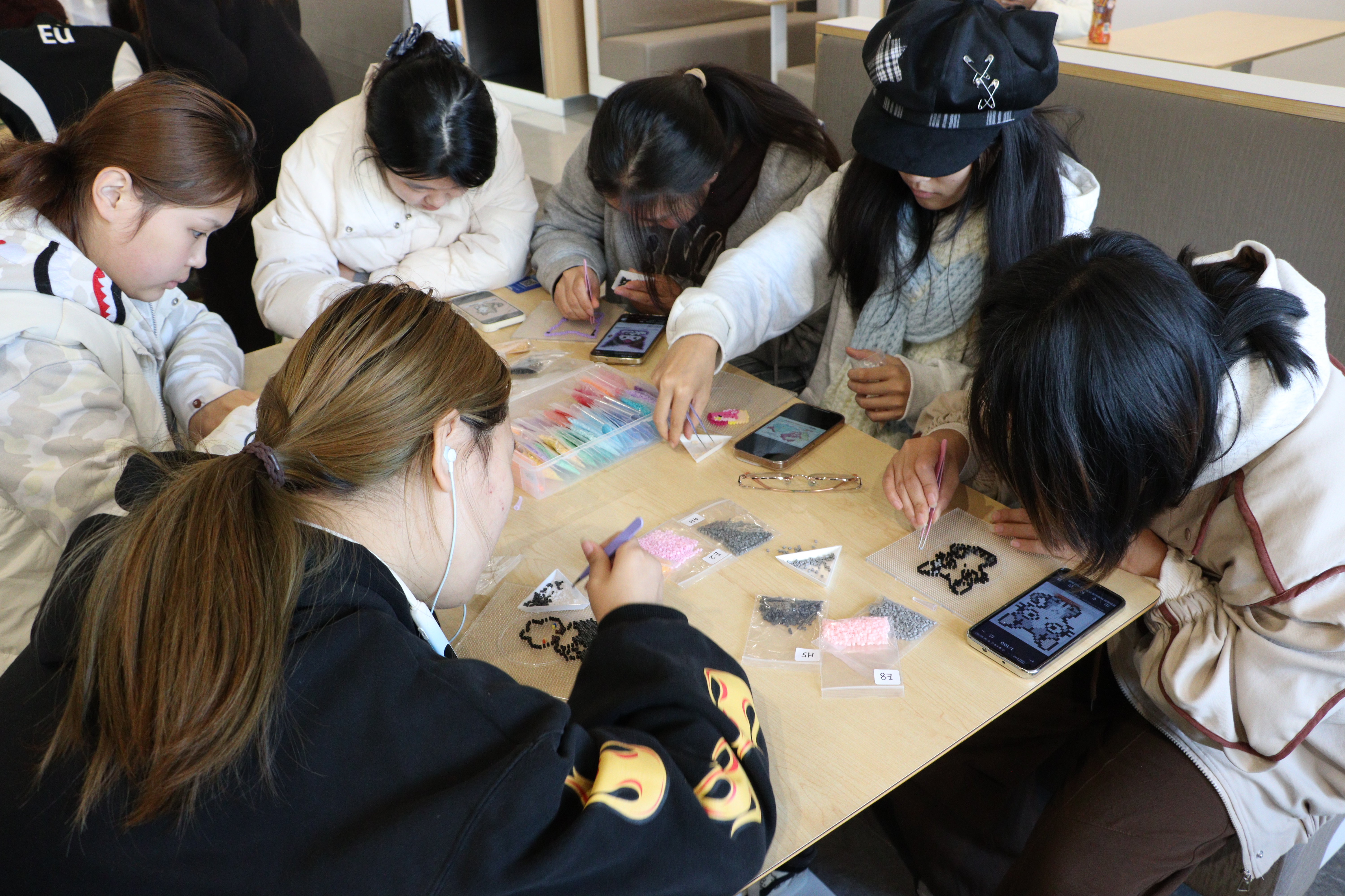 活动伊始,工作人员有序发放拼豆材料、模板及工具,为参与同学做好充足准备。期间,同学们在创作区域,或参照模板勾勒造型,或发挥创意自主设计,专注地将五彩拼豆逐一嵌入卡槽。创作过程中,大家相互交流技巧、分享灵感,现场氛围融洽,拍摄人员全程记录同学们的创作瞬间与精美作品,定格每份创意与喜悦。活动尾声,全体参与人员合影留念,负责人进行总结发言,对活动成效表示肯定并致谢所有参与者。