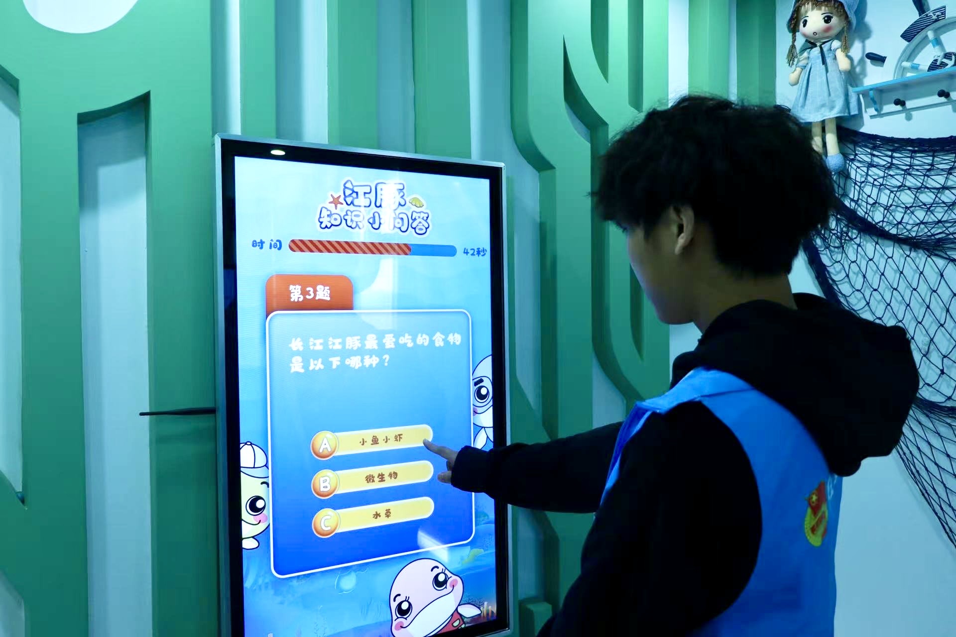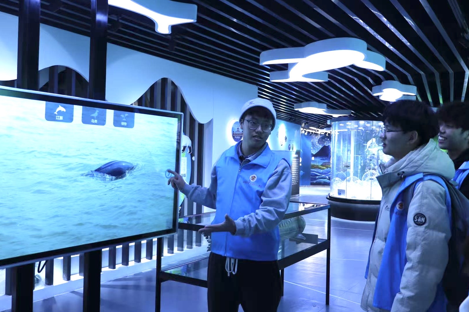 宣讲团成员结合提前准备的宣讲素材,在科教中心的科普展示区开展了一场小型宣讲,将江豚保护知识娓娓道来。“长江江豚,俗称‘江猪’,是中国特有物种,也是继白鱀豚功能性灭绝后,长江里仅存的鲸豚类动物,主要分布在长江中下游干流及洞庭湖、鄱阳湖,如今已按照国家一级保护动物标准进行保护管理。”宣讲成员手持科普手册,结合展区内的江豚模型,详细介绍江豚的基础习性、显著特征、生存危机与保护历程等。最后,大家发出呼吁:保护江豚不是专业人士的专属责任,而是每个人的义务,希望我们都能成为“微笑天使”的守护者,让它们永远畅游在长江之中。