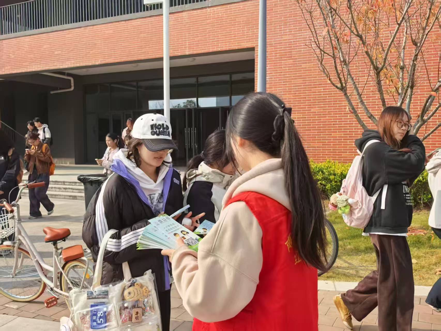 活动现场,医务人员身穿白色医护装,青年志愿者身着红色马甲,向师生发放折页,普及知识。他们耐心为过往师生讲解艾滋病的传播途径、预防措施、检测渠道等核心知识,详说安全性行为、拒绝共用注射器等要点,介绍折页上标注的周边疾控中心免费检测预约方式,帮助师生掌握艾滋防范相关内容,引导大家树立“健康第一责任人”理念,倡导“知艾不恐艾、防艾齐参与”的风气。