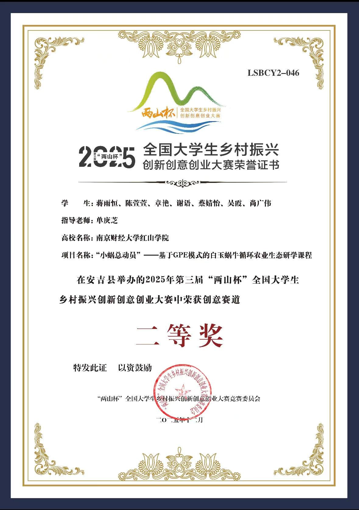 此次获奖是对团队实践成果的高度认可,也是学院深化创新创业教育、推进校地协同助力乡村振兴的重要成效体现。未来,学院团委将持续搭建青年学生投身乡村振兴的实践平台,引导广大青年学子以专业知识为支撑、以创新思维为引领、以务实行动为路径,深度参与乡村产业升级、文化传承、生态保护等各项事业。“垅间蜗行”团队也将以此为契机,持续优化研学课程与产业赋能方案,推动白玉蜗牛特色产业提质增效,让“小蜗牛”撬动“大产业”,在广袤乡野间续写“生态美、百姓富”的乡村振兴新篇章,以青春之力诠释新时代青年的使命与担当!