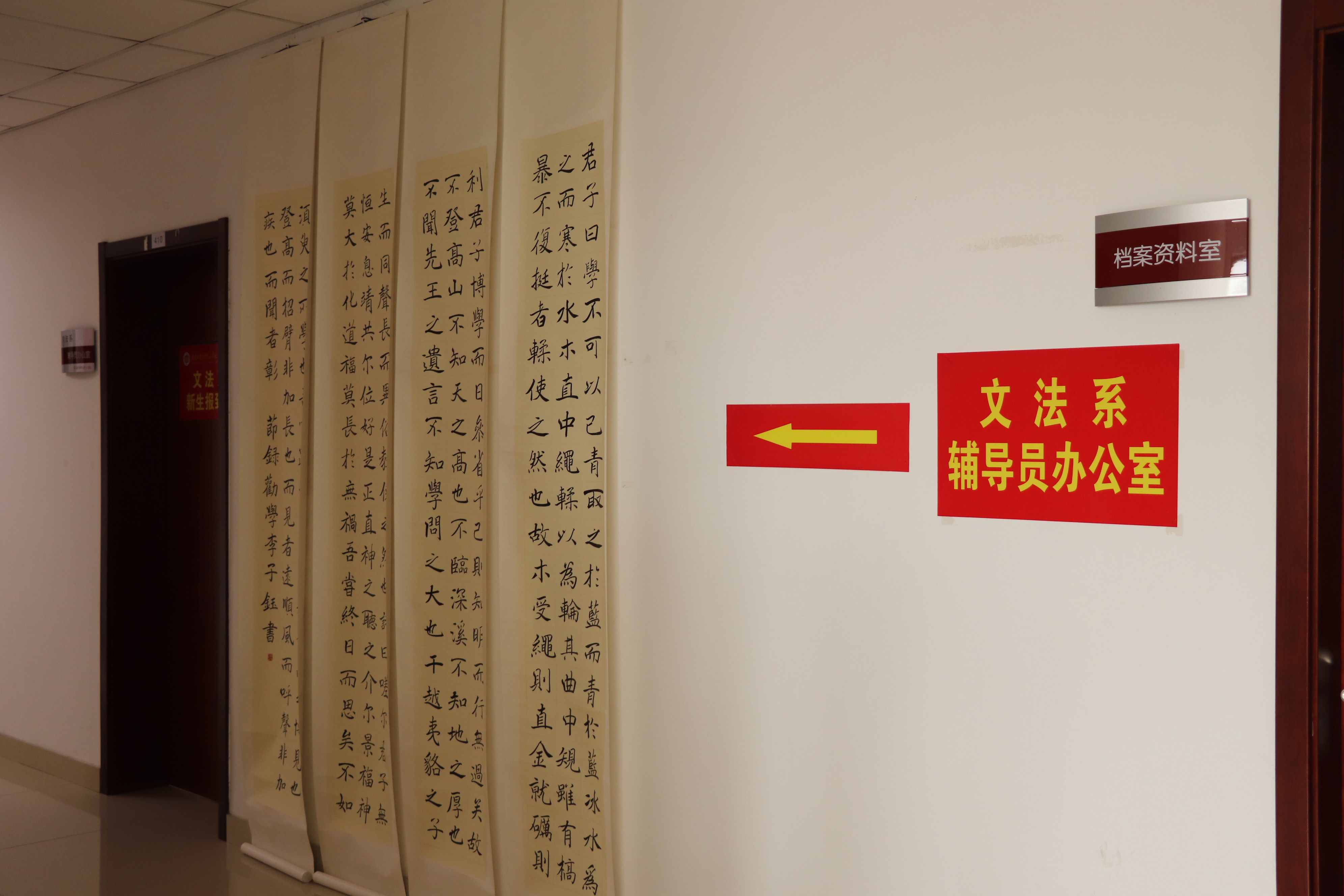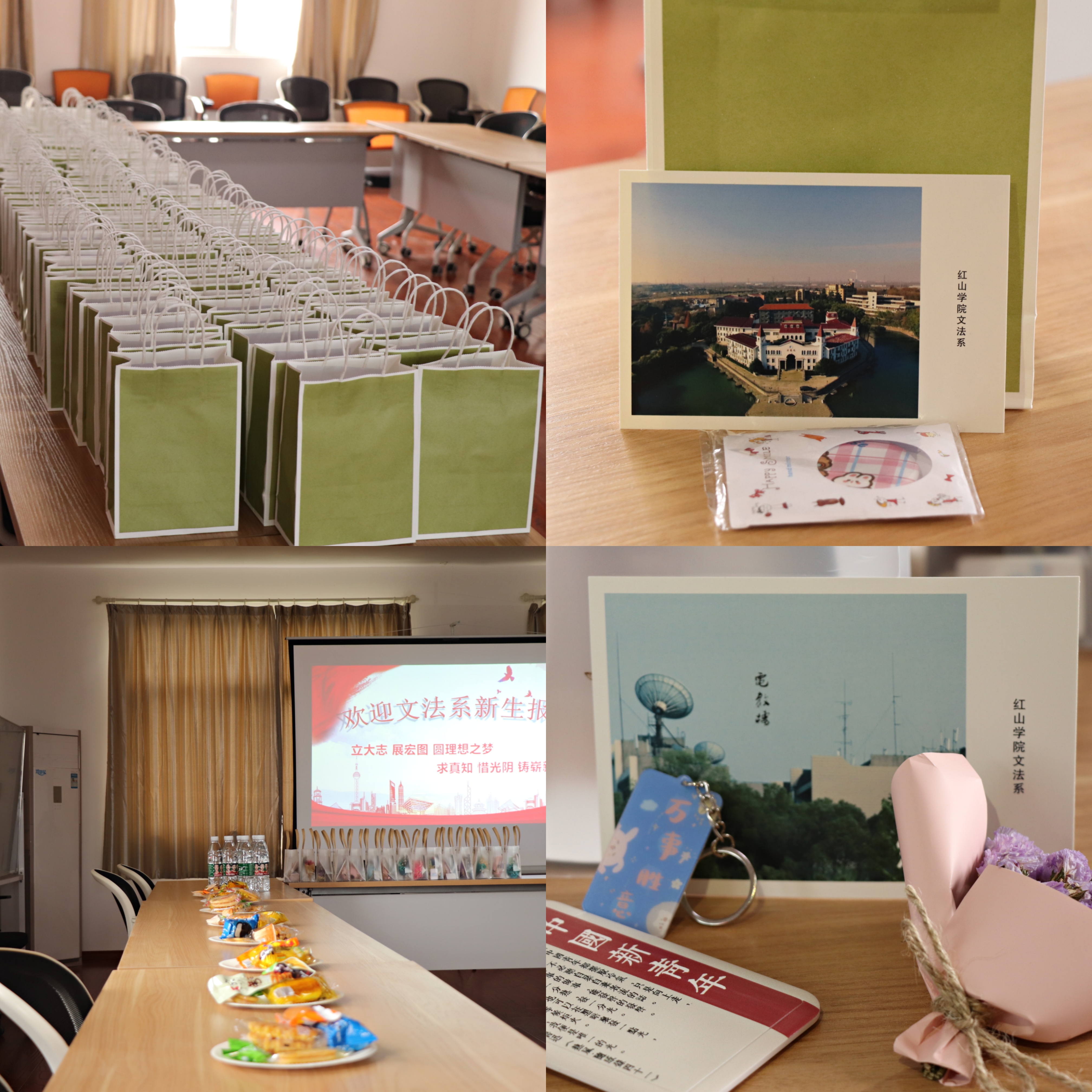 为迎接新生,文法系还准备了一些特色活动,新生辅导员李子钰在教务楼四楼悬挂了书法作品迎接新生入学,此外,文法系老师还贴心地为每一位新生准备了小礼品和小零食,并选取了15个有意义的数字,例如“72”代表中华人民共和国成立72周年,“100”代表中国人民共产党建党100周年,给相应顺序报到的同学分发幸运礼袋,让他们入学第一天就感受到了大学的温暖。