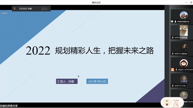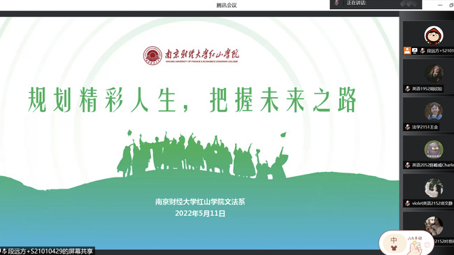 5月11日下午,万象城文法系通过腾讯会议平台举办“职业发展与就业创业指导月”线上讲座,本次讲座的主题为“规划精彩人生,把握未来之路”。本次会议邀请英语教研组组长陈希卉和法学教研组组长邱睿主讲,文法系团总支书记兼学工秘书段远方主持,该系全体学生在线参加。