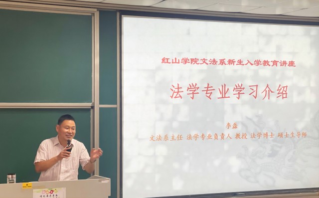 文法系主任、红山学院法学专业负责人李磊首先代表文法系全体师生,向新生的到来表示热烈的欢迎和衷心的祝贺。随后针对法学专业的专业前景、学科方向、培养目标及就业形势等方面做了深刻阐述,并勉励同学在学习和实践中不断积累,充实自我、提升自我。